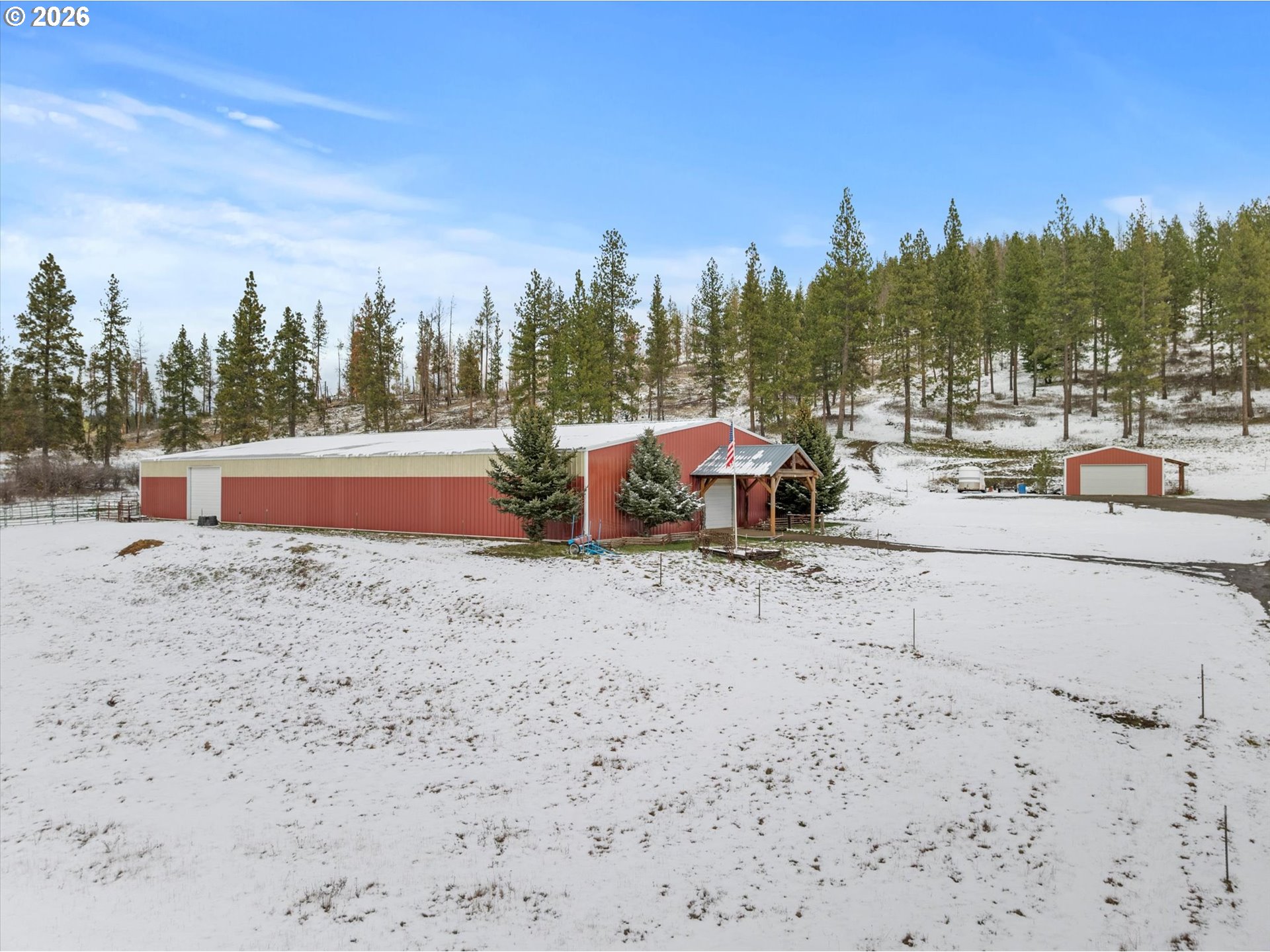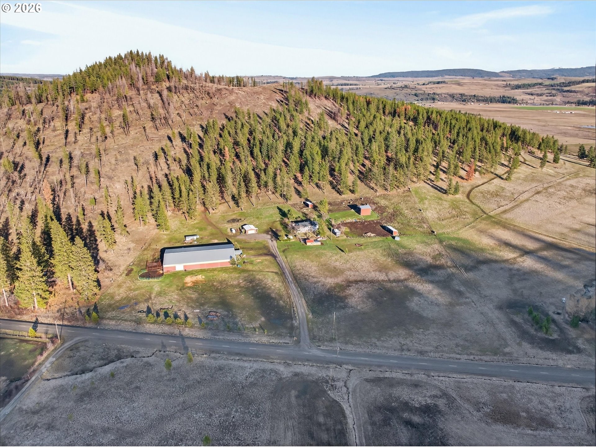 Nearly 40 private acres of rolling pasture and mature timber set the stage for this exceptional equestrian property, anchored by an impressive 11,200 sq ft indoor arena/barn designed for year-round riding and training. The 2,512 sq ft home features 3 bedrooms and 2.5 baths, along with several thoughtful modern updates throughout. A gas stove is the centerpiece of the main living area, creating a warm and welcoming gathering space. Expansive windows and a generous deck frame stunning valley and mountain views in every season. A large unfinished basement provides abundant storage and the opportunity to expand living space, hobby area, or additional guest quarters. The arena includes multiple stalls and an impressive viewing deck, creating a functional and versatile space for training, livestock use, or events. Additional improvements include a hay cover, livestock shelters, oversized garage/shop, and a well-built chicken coop ready for your flock. The blend of open pasture and timbered ground offers versatility for horses, livestock, recreation and enjoying the natural surroundings. Wide-open skies, privacy, and substantial improvements combine to make this a standout property in a highly desirable setting. Offering space, privacy, and established infrastructure just minutes from town, this is a rare opportunity to own a true horse property!